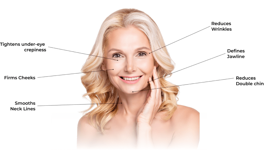 This helps to safely fade fine lines and wrinkles, reduce double chin, and lift and tighten skin for a more radiant complexion — all without needles or injections!