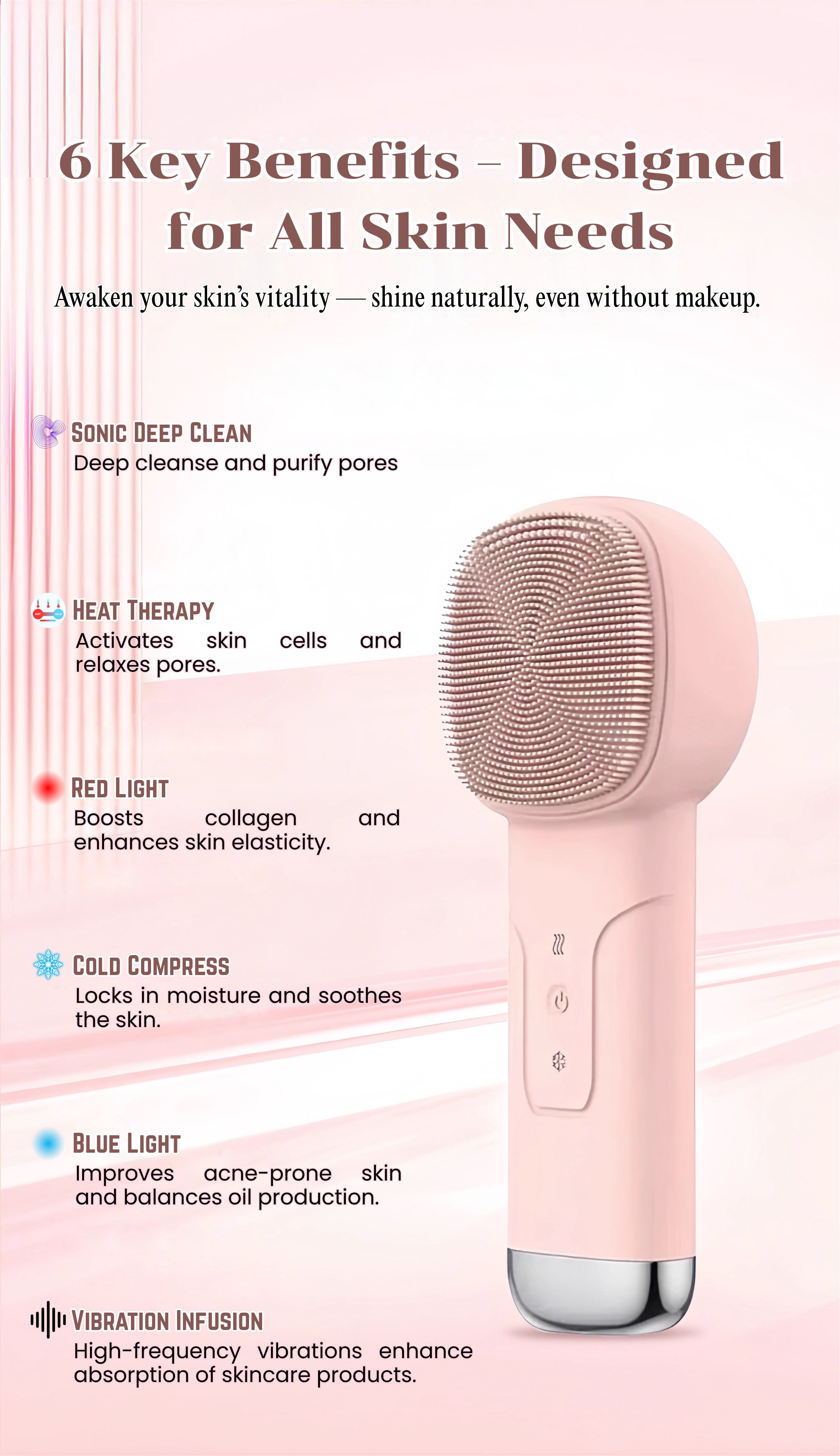 The Mernea™ Facial Washing Machine provides ultrasonic deep cleaning, hot & cold compress functions, and red & blue light therapy. It also features three vibration levels for customized use, offering a comprehensive skincare experience that improves skin tone, tightens pores, and promotes a healthy glow.